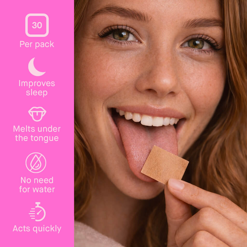 A gentle alternative for those who wish to avoid swallowing pills. The strip dissolves smoothly with a pleasant taste. Slip it into your pocket or place it on your nightstand, it is designed to support your rest, wherever you are.